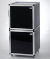 SICCO Desiccators are designed for storing or drying humidity sensitive products using silica gel. The tight fitting door protects the contents from contamination from the atmosphere. The controlled environment inside the desiccators are ideal for storing reference materials, retained samples, metallographic specimen, tobacco and DNA-samples.Aluminium frame. Black, non-transparent acrylic glass panels reduce light incidence and protect against ultraviolet radiation. Two compartments and two doors, including four shelves made of stainless steel, two trays and two hygrometers, four castors, usable with up to 8 shelves per compartment. Internal dimensions and nominal volume per chamber.
