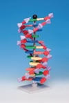 The advanced miniDNA® system comprises colour-coded, abstract-shaped parts designed to represent the nitrogenous bases, pentagonal sugar and pyramidal phosphate components needed to make a double-helix model of DNA. The three hydrogen bonds that connect Cytosine to Guanine and the two that connect Thymine to Adenine are represented by the appropriate number of pegs. Two DNA kits are available to make either a 12-layer (1 turn) or 22-layer (2 turns) DNA model. The models can be displayed on their stands, or unzipped into a ladder form to demonstrate the process of Replication.